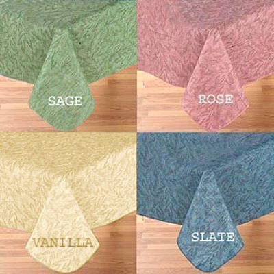 This attractive tablecloth features an overall tone on tone vining damask leaf design that adds visual texture to a solid vinyl cloth Our Sonoma tablecloth features a flannel back for table protection and will not skid once in place Available in four lovely colors: sage, rose, vanilla, and slate Complete the look with matching place mats which are fully reversible Read more...